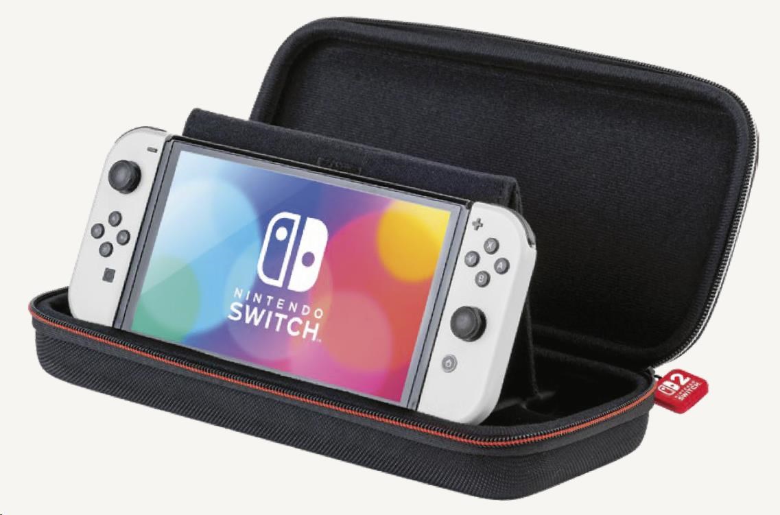 V tomto luxusním přepravním pouzdru od společnosti Nacon můžete bezpečně a pohodlně přenášet nejenom novou herní konzoli Nintendo Switch 2, ale také herní konzoli Nintendo Switch nebo Switch – OLED Model. Ústředním prvkem tohoto pouzdra je nastavitelný stojánek, který při hraní umožňuje pohodlněji sledovat dění na obrazovce, zatímco při přepravě chrání obrazovku i analogové páčky konzole před poškozením. Na jeho vnitřní straně se navíc nachází dvanáct kapsiček pro uložení karet s vašimi oblíbenými hrami. Součástí balení jsou pak také dvě menší plastová pouzdra pro microSD karty.
