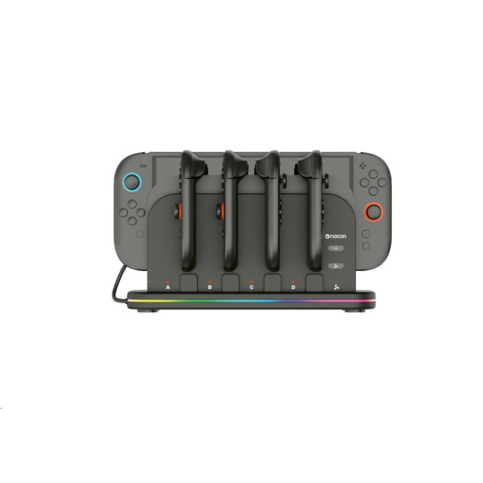 Tato nabíjecí dokovací stanice od společnosti Nacon přijde vhod všem majitelům nové herní konzole Nintendo Switch 2 i původní herní konzole Nintendo Switch, kteří často potřebují nabíjet větší počet ovladačů Joy-Con. Stanice umožňuje nabíjet současně až čtyři ovladače, jakož i samotnou konzoli, jejímuž přehřátí zabraňuje zabudovaný chladicí větráček. O stavu nabíjení každého z ovladačů informuje příslušný LED ukazatel, zatímco RGB proužek s výběrem z devíti různých efektů dodává stanici stylový, moderní vzhled. Protože napájecí USB-C kabel není součástí balení, slouží k připojení stanice do elektrické sítě originální napájecí příslušenství dodávané s konzolí.