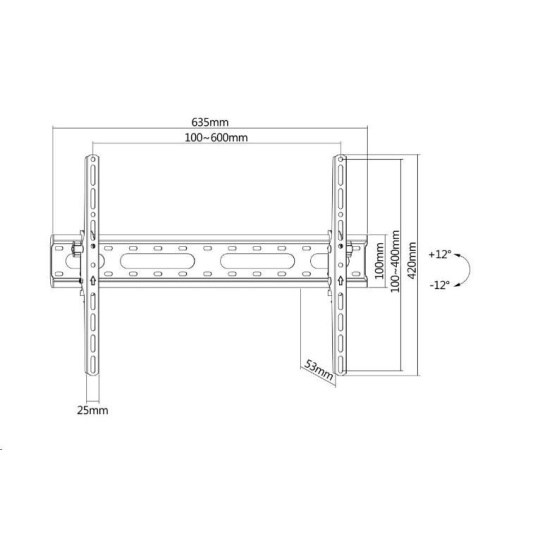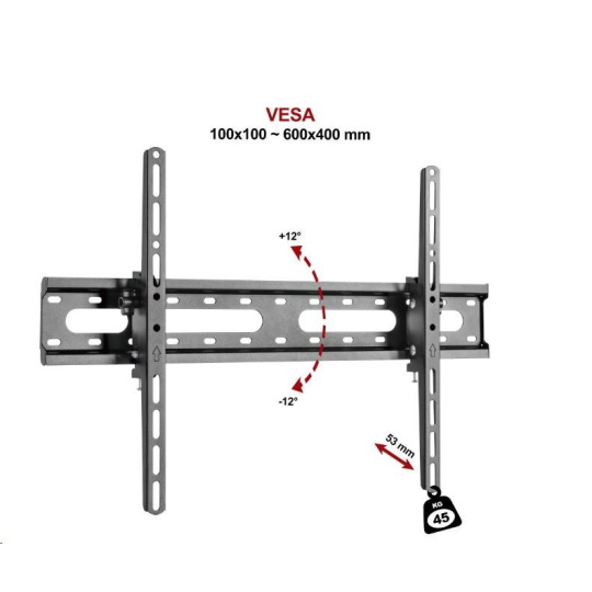 Držák na televize a displeje Fiber Novelty FN45T Držák na televize a displeje 37" - 75", naklápění +12° / -12°, vzdálenost od zdi 53mm, aretace proti vysazení, VESA standardy 100x100 až 600x400, nosnost 45kg Naklápěcí držák na televize a displeje Fiber Novelty FN45T Kvalitní nástěnný držák ideální pro bezpečné zavěšení televizorů nebo displejů s úhlopříčkou 37" až 75". Držák umožňuje snadné naklápění obrazovky pod úhlem od +12° až do -12°, potřebný úhel náklonu snadno zaaretujete. Vzdálenost obrazovky od zdi 53mm, zajištění proti vysazení, rozměr základové desky 635x100mm, materiál kov. Držák podporuje VESA standardy od 100x100 do 600x400mm, nosnost 45kg. Balení obsahuje instalační materiál. Záruka na držák 5 let. Technické údaje: nosnost 45 kg na televize, displeje a monitory s úhlopříčkou 37" - 75" podporuje VESA standardy 100x100 až 600x400 možnost naklápění +12° / -12° zajištění obrazovky v požadovaném náklonu vzdálenost od zdi 53mm aretace proti vysazení rozměr základové desky 635 x 100 mm balení obsahuje instalační materiál materiál kov barevné provedení černé záruka 5 let.