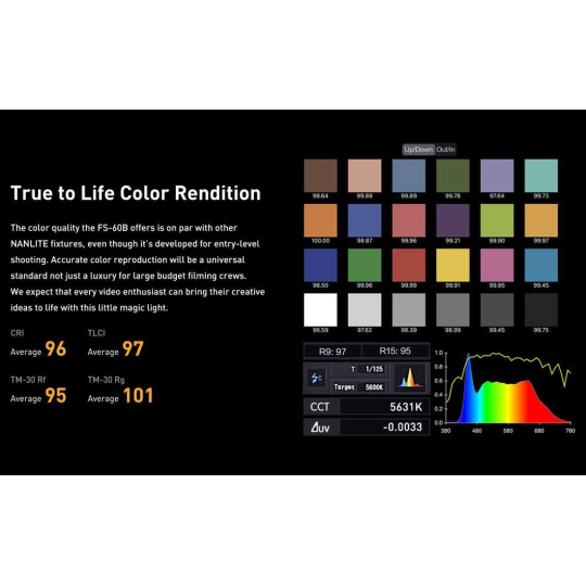 - Přesný a velmi barevný výkon podobný pokročilým světlům Nanlite
