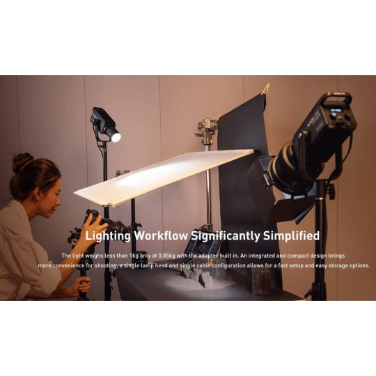 Nasviťte si své live streamy, videa a fotografie pomocí tohoto malinkého světla, které váží pouhých 0,87 kg. Toto kompaktní, výkonné a univerzální světlo má 45° reflektor, který nabízí výkon 6 228 lumenů. Ve vzdálenosti 1 metru vyzařuje 13 360 luxů světla vyváženého jako denní světlo s teplotou 5 600 K. Světlo má navíc rozsah barevných teplot 2700–6500K a vysoké indexy CRI/TLCI s hodnotami 96/97, což zajišťuje pokročilé a přesné podání barev. Dvoubarevné provedení světla poskytuje jak teplejší umělé tóny, tak chladnější tóny denního světla a zachovává přitom příjemné tóny pleti.