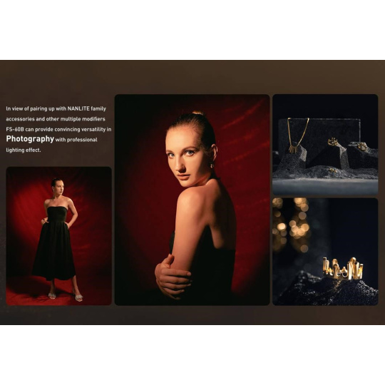 Světlo FS-60B je ultra kompaktní a dodává se s bajonetem FM (stejně jako světlo Forza 60) pro obrovský počet nástrojů pro modelování světla společnosti Nanlite, jako jsou Fresnelové čočky, softboxy a deštníky, abyste mohli světlo změkčit a vymodelovat. Součástí dodávky je také adaptér bajonetu Bowens k zajištění větší kompatibility s širokou řadou modifikátorů světla. Do třmenu a adaptéru Bowens jsou navíc také vestavěny držáky deštníků, což poskytuje ještě další možnosti změkčení světla.