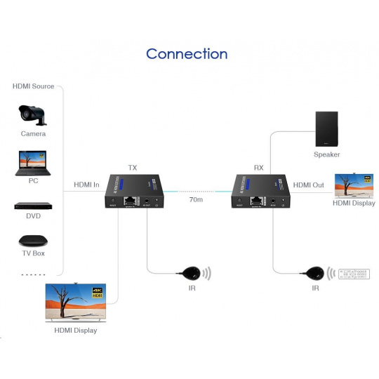 - HDMI signál lze přenášet až do 70m přes kabel Cat.6 / 6A / 7; až 40 m na kabelu Cat.5E
