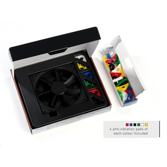 ventilátor, ultratichý, rozměry 120x120x25mm, hlučnost 17.8dB, průtok 107.5 m3/h, 300 až 1200 otáček, optimalizovaná geometrie a povrch lopatek, SSO2, edice Chromax - vyměnitelné barevné antivibrační podložky