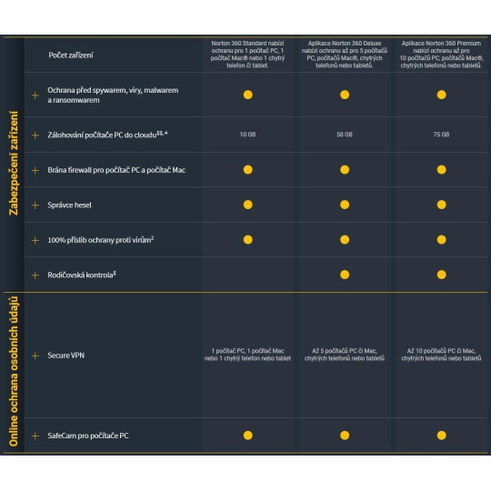 Norton 360 Deluxe poskytuje komplexní ochranu před malwarem až pro 5 počítačů PC, počítačů Mac, zařízení se systémem Android nebo iOS, plus funkci rodičovské kontroly, která pomáhá chránit vaše děti online, správce hesel pro ukládání a správu hesel a funkci zálohování PC do cloudu.