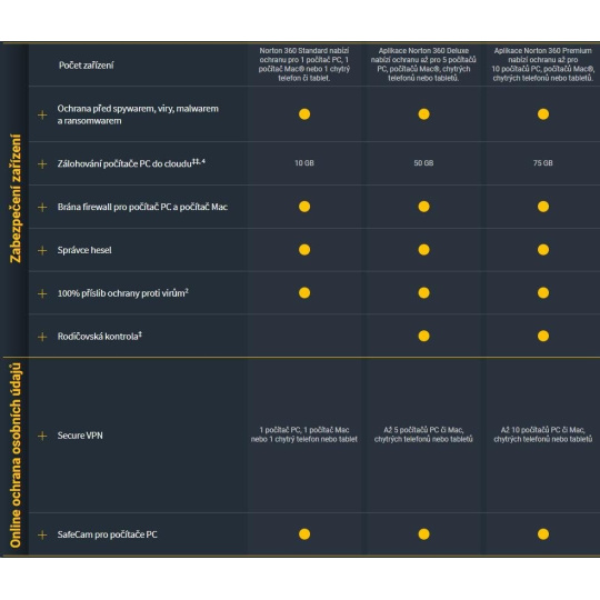 Elektronická licence Norton 360 Premium poskytuje komplexní ochranu před malwarem až pro 10 počítačů PC, počítačů Mac, zařízení se systémem Android nebo iOS, plus funkci rodičovské kontroly, která pomáhá chránit vaše děti online, správce hesel pro ukládání a správu hesel a funkci zálohování PC do cloudu.. Norton 360 Premium zahrnuje také síť VPN pro 10 zařízení a aplikaci ochrana kamery před zneužitím pro počítače PC. Určeno pro nové uživatele i k obnově licencí stávajících uživatelů
