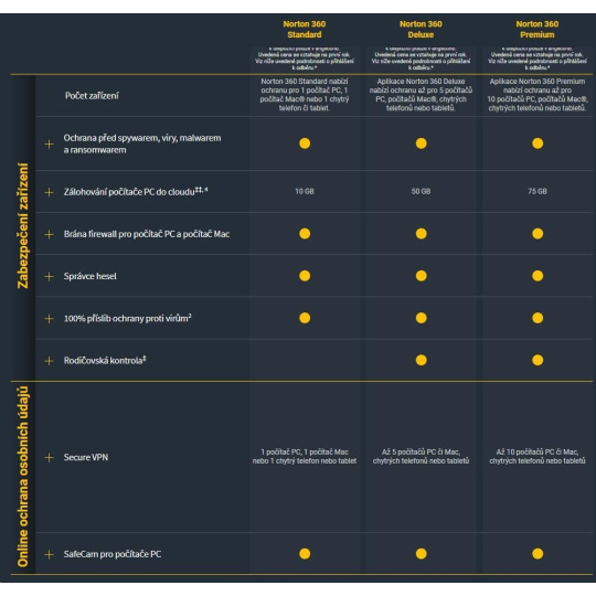 Norton 360 Standard poskytuje komplexní ochranu před malwarem pro jeden počítač PC, počítač Mac, zařízení se systémem Android nebo iOS a funkci zálohování do cloudu pro počítač PC, což pomáhá zabránit ztrátě dat kvůli ransomwaru nebo selhání pevného disku, a správce hesel pro ukládání a správu vašich hesel. Norton 360 Standard také obsahuje funkci ochrana sítě VPN, která vám umožňuje bezpečnější a anonymnější procházení webu, a to i ve veřejných sítích Wi-Fi a aplikaci ochrana kamery před zneužitím pro počítače PC.