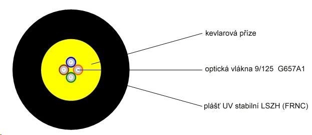 Optický singl mode 4 vláknový univerzální - černý (vnitřní/venkovní) samonosný kabel DROP FTTH v návinu 1000 m na cívce v samoodvíjecím boxu. Použitá jsou vlákna G.657A1.