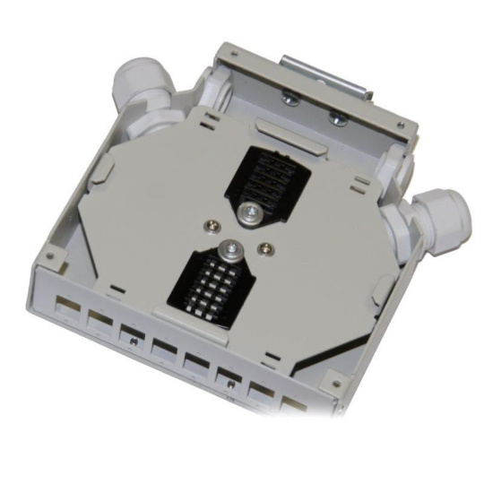 Optický rozvaděč na DIN lištu 8x SC simplex (8x LC duplex) s hřebínky na 16 svarů, bílý