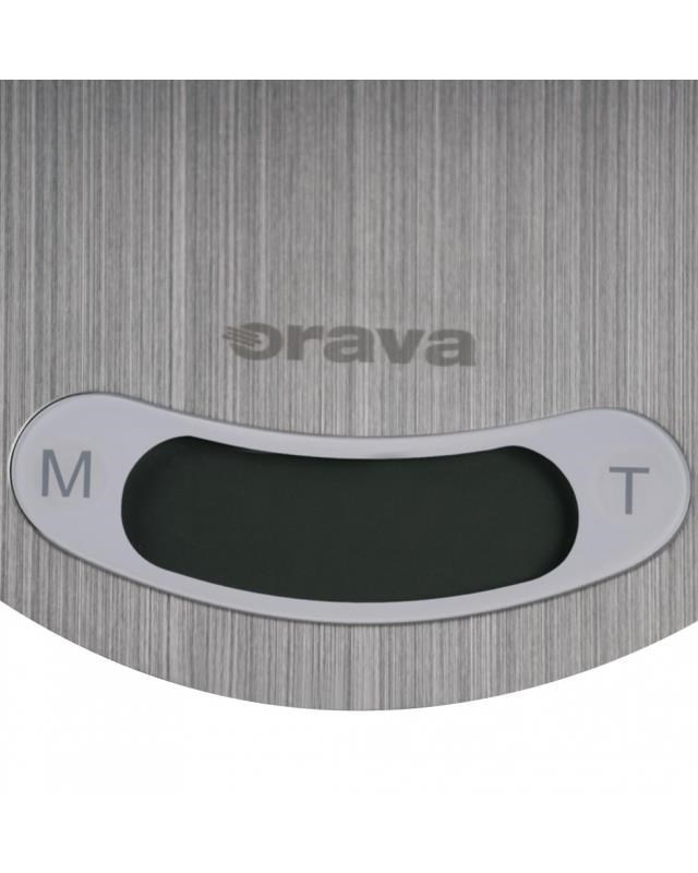 Digitální kuchyňská váha, Nerezový povrch pro snadnou údržbu, Praktické ucho na zavěšení váhy, Velký LCD displej, Váživost do 5 000 g (přesnost 1g), Měření objemu vody a mléka (ml / cup), Vážení hmotnosti (g / oz), Funkce dovažování / nulování TARE, Velká tlačítka pro pohodlné ovládání, Automatické vypnutí při nečinnosti, Indikace slabé baterie a přetížení, Napájení: 3x 1,5 V AAA.