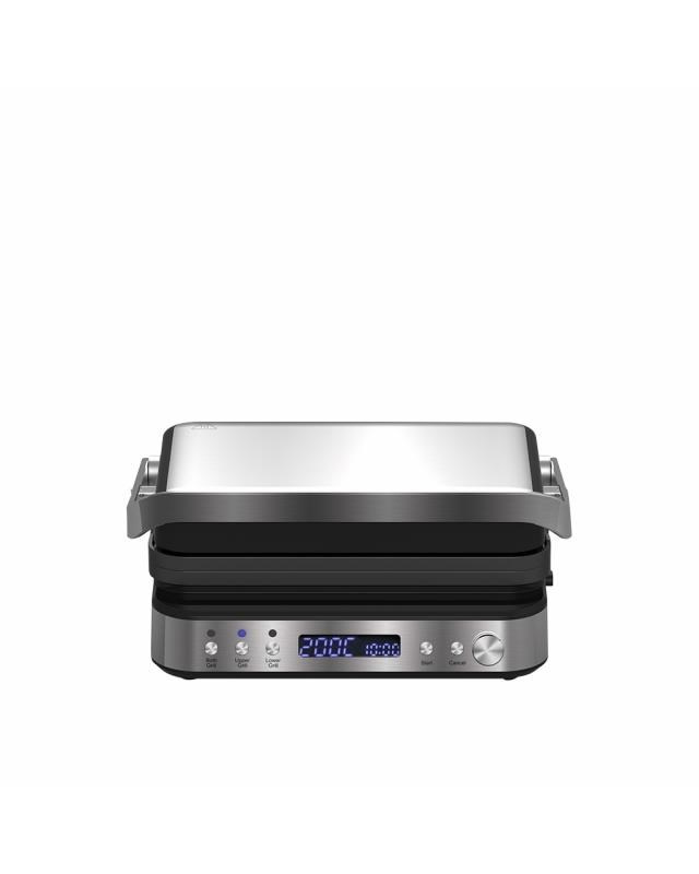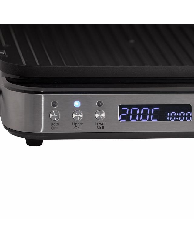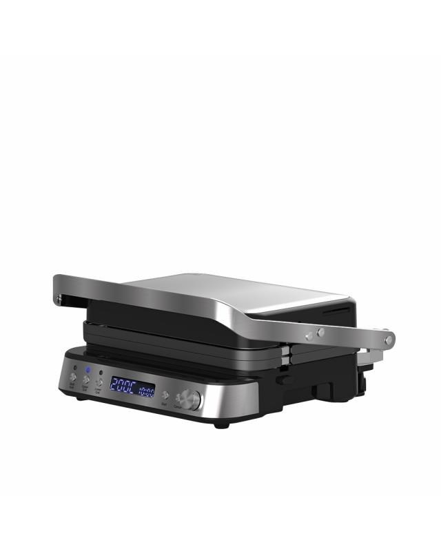 Výkonný elektrický stolní kontaktní gril, Funkce otevřeného i kontaktního grilu, Samostatně regulovatelná teplota (každá plocha samostatně), Kombinace 2 grilovacích ploch (hladký a žebrovaný povrch), Variabilní nastavení teploty 80 až 230 ° C, Grilovací desky s nepřilnavou vrstvou, Časovač s automatickým vypnutím, Velký LCD displej, Zvuková signalizace, Tepelně izolovaná rukojeť, Miska na odkapávání šťávy a oleje, Snadné čištění, odnímatelné grilovací desky, Protiskluzové gumové nožičky pro větší stabilitu, Napájení: 230V ~ 50 Hz, 2 000 W.