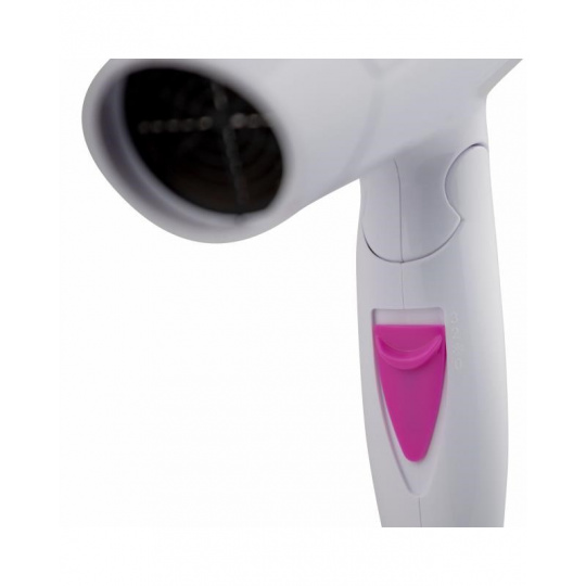 "Cestovní fén se sklopnou rukojetí,2 stupně výkonu a teploty vzduchu, Praktické očko na zavěšení, Napájení: 220 - 240 V ~ 50/60 Hz, 1 200 W".
