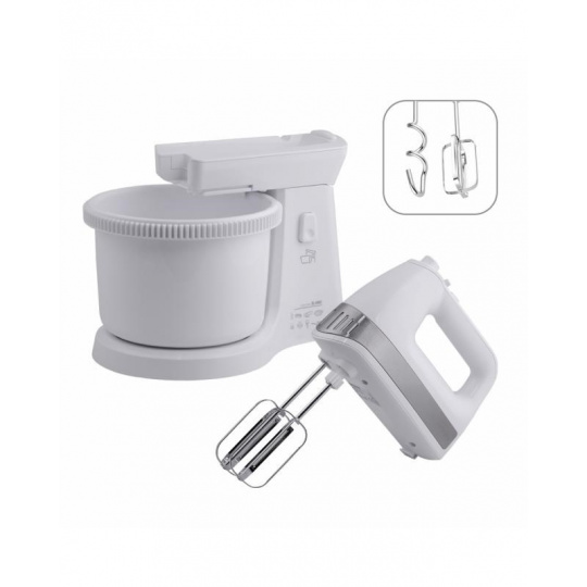 Elektrický ruční šlehač s otočnou nádobou, 5 rychlosti a funkce TURBO pro maximální výkon, 2,5 l otočná nádoba s mechanickým pohonem, Sada šlehacích metel a metel na hnětení, výklopné rameno, Napájení: 220 - 240V ~ 50 / 60Hz, 400 W.