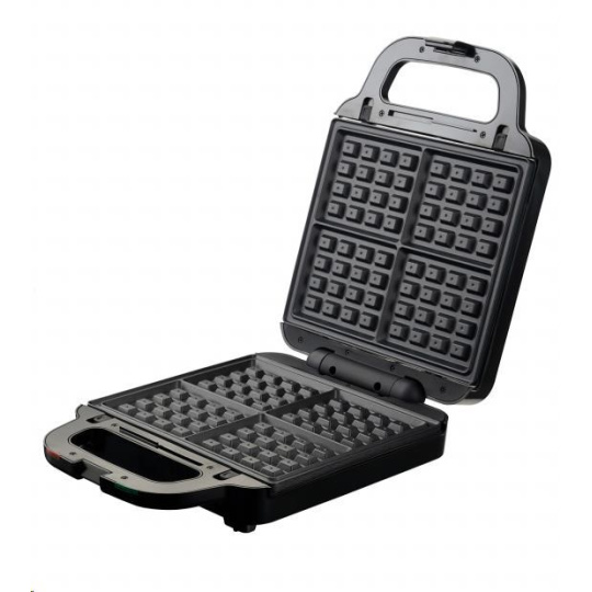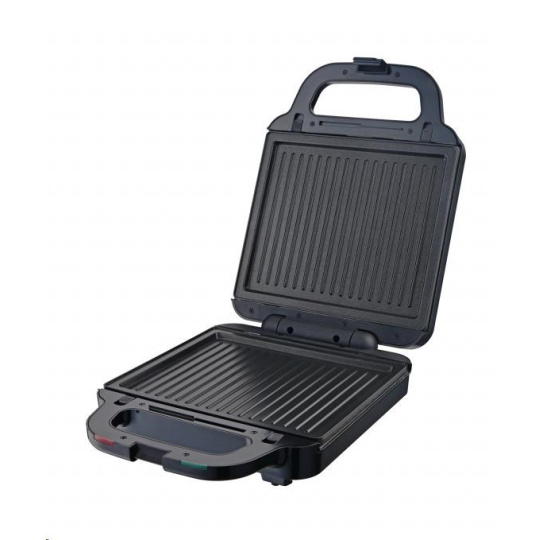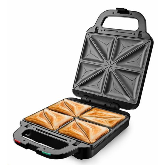 Multifunkční toustovač 3 v 1, 3 výměnné desky s kvalitním nepřilnavým povrchem, Sendvičovač pro 4 sendviče, vafle a grilování, Funkce otevřeného grilu, Tepelně izolované držadlo, Jednoduché čištění, plotny omyvatelné i v myčce nádobí, Světelná signalizace (napájení, ohřev) Tepelná pojistka, Napájení: 220 - 240V~ 50Hz, 1 400 W.