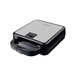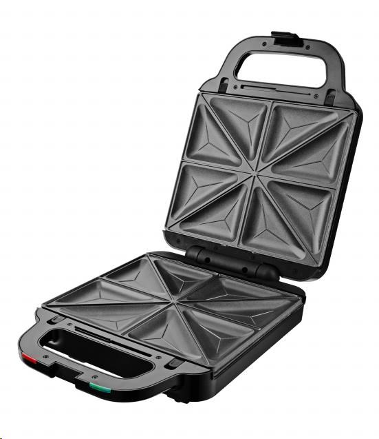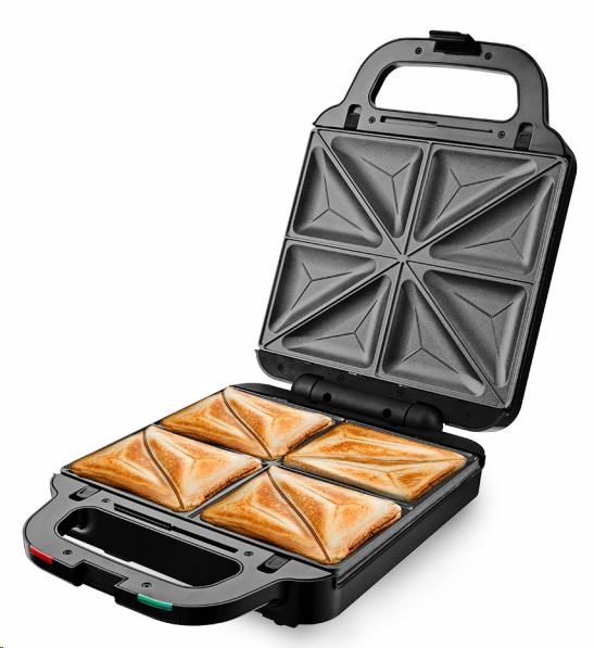 Multifunkční toustovač 3 v 1, 3 výměnné desky s kvalitním nepřilnavým povrchem, Sendvičovač pro 4 sendviče, vafle a grilování, Funkce otevřeného grilu, Tepelně izolované držadlo, Jednoduché čištění, plotny omyvatelné i v myčce nádobí, Světelná signalizace (napájení, ohřev) Tepelná pojistka, Napájení: 220 - 240V~ 50Hz, 1 400 W.