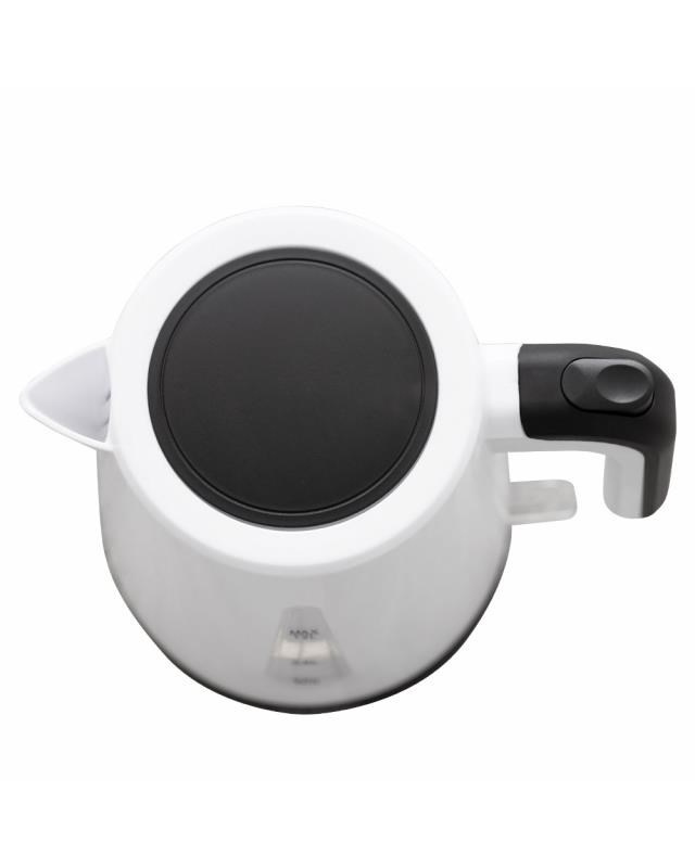 "Elektrická varná konvice. Objem vody Max. 1,2l. Varná nádoba na odnímatelném 360° otočném podstavci. Topné těleso překryté plotnou z ušlechtilé oceli. Ochrana před ohřevem bez vody. Automatické vypnutí. Síťová šňůra odkladatelná v podstavci. Napájení: 220 - 240V~ 50/60Hz, 1 200 W".