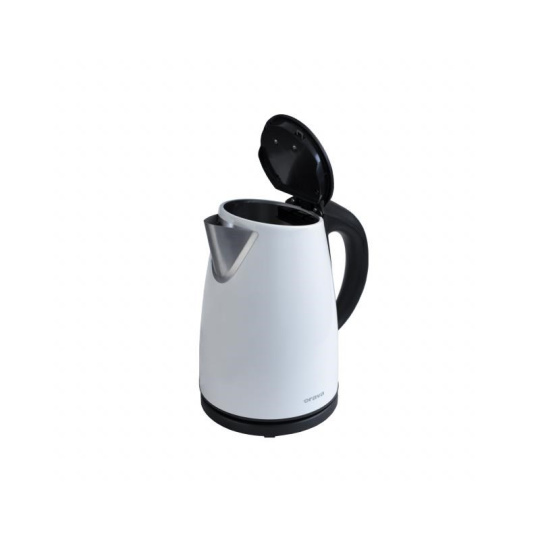 Elektrická varná konvice - bílá. Varná nádoba z ušlechtilé nerezové oceli. Objem 1,7l. Otevírání vrchního víka konvice stisknutím tlačítka. Varná nádoba na odnímatelném 360° otočném podstavci. Topné těleso překryté plotnou s ušlechtilé oceli. Stupnice hladiny vody. Ochrana před ohřevem bez vody. Auto vypnutí. Vyjímatelné filtrační sítko na vodu. Síťová šňůra odkladatelná v podstavci. Napájení 230V 50 Hz, 2000 W.
