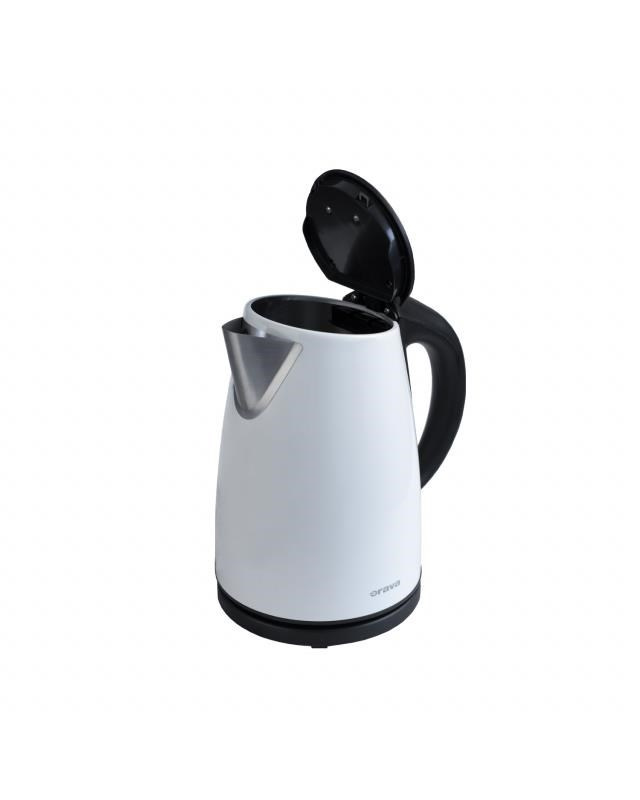 Elektrická varná konvice - bílá. Varná nádoba z ušlechtilé nerezové oceli. Objem 1,7l. Otevírání vrchního víka konvice stisknutím tlačítka. Varná nádoba na odnímatelném 360° otočném podstavci. Topné těleso překryté plotnou s ušlechtilé oceli. Stupnice hladiny vody. Ochrana před ohřevem bez vody. Auto vypnutí. Vyjímatelné filtrační sítko na vodu. Síťová šňůra odkladatelná v podstavci. Napájení 230V 50 Hz, 2000 W.