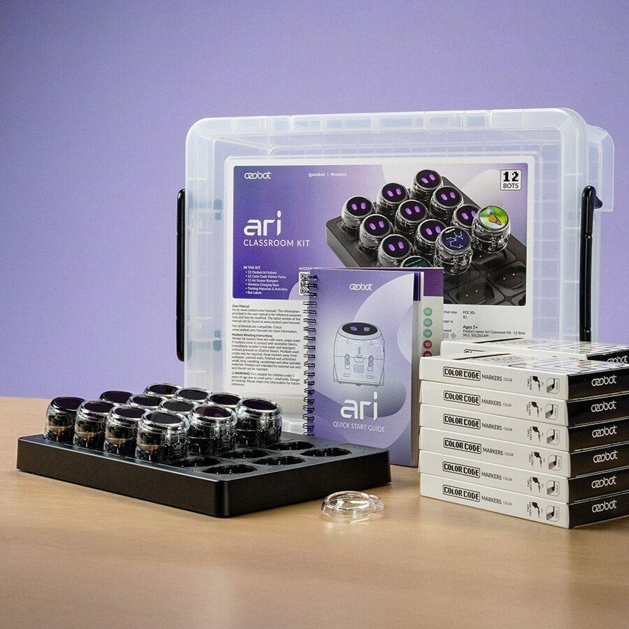 Ve školní sadě vedle 12 robotů Ari a nabíjecí stanicenajdete i soubor aktivit, které vám pomohou s prvními krůčky. Nechybí ani 12 sad omyvatelných fix s dvojím hrotem, abyste se rovnou mohli pustit do kreslení barevných kódů a vlastních spletitých drah. Šířka stopy popisovačů je přizpůsobená přímo senzorům malého bota. Ten se tak lépe orientuje na vašich trasách a odbočkách a nevyžaduje tak častou kalibraci. Tato výbava, bez které se na začátku se svými studenty neobejdete, je dodávána pěkně pohromadě v prostorném úložném boxu.