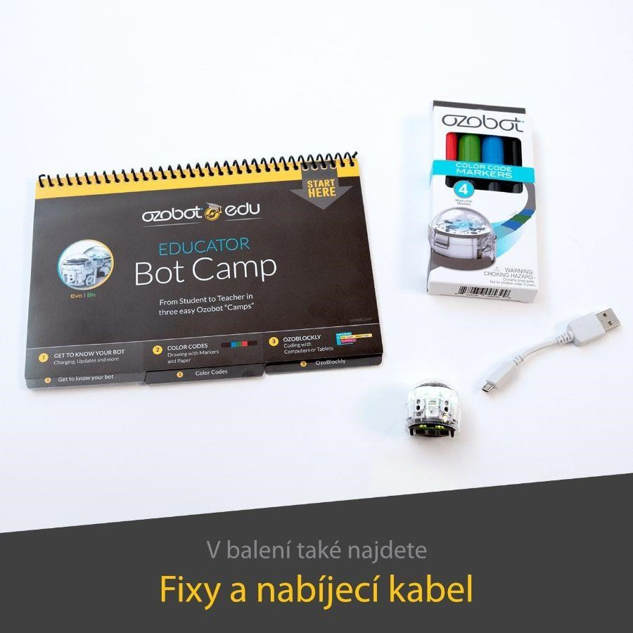 Tato sada pro školy a zájmové kroužky je vybavená vším, co potřebují velké týmy, aby se do kódování mohly hned pustit. Vedle 18 Ozobotů Evo v ní najdete i soubor aktivit, které vám pomohou do tajů programování hladce proniknout. Nechybí ani set 18 omyvatelných fix, které dětem usnadní do kreslení barevných kódů a vlastních spletitých drah. Šířka stopy popisovačů je přizpůsobená přímo senzorům malého bota. Ten se tak lépe orientuje na jejich trasách a nevyžaduje tak častou kalibraci. Radost malým programátorům určitě udělá i množství barevných samolepek. Novinkou je pak nabíjecí matrice, která se postará i o automatickou aktualizaci softwaru. Má nízký profil a skromné rozměry, aby nikdy nepřekážela. Součástí balení je AC/DC adaptér pro zapojení nabíjecí stanice do standardní elektrické zásuvky.