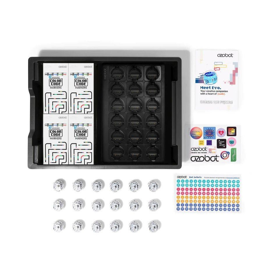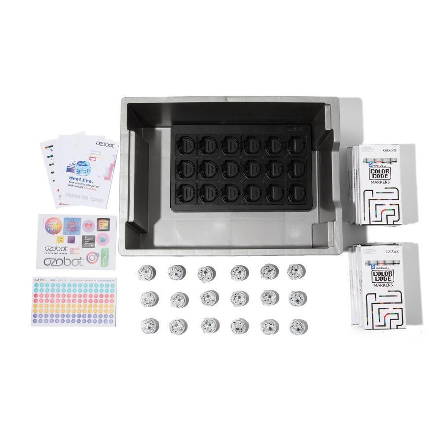 Tato sada pro školy a zájmové kroužky je vybavená vším, co potřebují velké týmy, aby se do kódování mohly hned pustit. Vedle 18 Ozobotů Evo v ní najdete i soubor aktivit, které vám pomohou do tajů programování hladce proniknout. Nechybí ani set 18 omyvatelných fix, které dětem usnadní do kreslení barevných kódů a vlastních spletitých drah. Šířka stopy popisovačů je přizpůsobená přímo senzorům malého bota. Ten se tak lépe orientuje na jejich trasách a nevyžaduje tak častou kalibraci. Radost malým programátorům určitě udělá i množství barevných samolepek. Novinkou je pak nabíjecí matrice, která se postará i o automatickou aktualizaci softwaru. Má nízký profil a skromné rozměry, aby nikdy nepřekážela. Součástí balení je AC/DC adaptér pro zapojení nabíjecí stanice do standardní elektrické zásuvky.