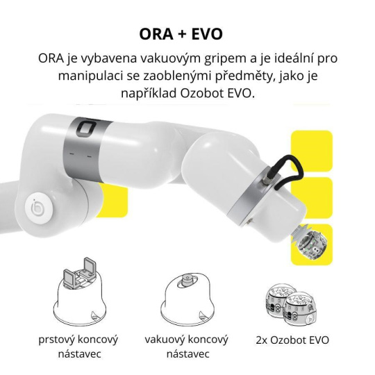 Při výšce téměř tři čtvrtě metru má plně vysunuté rameno ORA poloměr dosahu 440 mm. Je vybaveno prstovým a vakuovým úchopem, aby bylo schopno zvedat, přemisťovat a manipulovat s předměty ve svém okolí. Díky šesti nezávisle ovladatelným osám mohou studenti naprogramovat ORA tak, aby pracovala v téměř libovolné poloze a splnila jakýkoli úkol nebo výzvu, se kterou se setkají. Díky konstrukci plug and play lze kobota snadno zprovoznit pomocí přiloženého napájecího zdroje, nouzového zastavení a montážního příslušenství. Ani jeho programování není neřešitelným rébusem. Programy pro robotické rameno budete vytvářet v blokovém Ozobot Editoru, který je založen na známém rozhraní Ozobot Blockly. Rozlišuje několik úrovní kódování, aby práci v něm zvládli jak začátečníci, tak i pokročilí uživatelé. Tento editor lze také přepnout do programovacího jazyka Python.