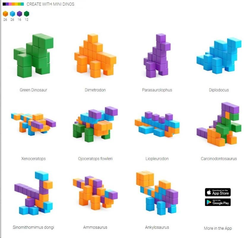Řada PIXIO Mini Dinos obsahuje 80 bloků PIXIO ve 4 barvách. Umožní oživit vaše kreativní nápady a