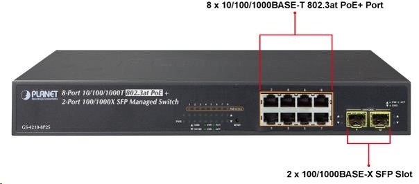 Planet GS-4210-8P2S PoE+ switch 8x 10/100/1000Base-T, 2x SFP, 802.3at do 120W, VLAN, SNMP/WEB