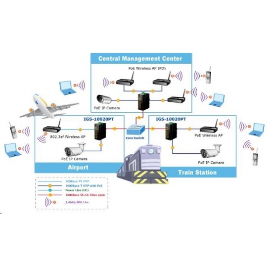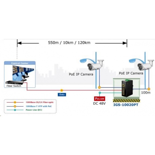 Planet IGS-10020PT PoE switch 8x 1000Base-T, 2x SFP, 802.3af 130W, IP30, -40 až 75°C, SNMP, IGMPv3, IPv6 Inteligentní přepínače pro průmyslový Ethernet jsou určeny do náročných provozních podmínek s velkým rozsahem pracovních teplot, nejistým napájením a častými otřesy. Zároveň poskytují vynikající možnosti vícenásobných propojení pro dosažení robustnosti propojení systémů s velmi nízkou dobou zotavení. IGS-10020PT je vybaven pro redundanci kromě dobře známé metody Spanning Tree (jejíž doba zotavení je v řádu sekund) především specializovanou funkcí "Redundant ring" která má dobu zotavení a nalezení nové cesty do 300ms. Jako PoE přepínač umožňuje přímo napájet až 8 koncových zařízení dle normy IEEE 802.3af, je tak ideálním prvkem pro aplikace se sníženou možností napajení. Přepínače řady IGS se snadno instalují na standardní DIN lištu nebo přímo na zeď a umožňují nasazení dobře známé Ethernetové technologie i v průmyslovém prostředí. Stejně tak jsou vhodné pro instalace do venkovně umístěných skříní s velkým kolísáním pracovních teplot (typicky bezdrátové a MAN ISP aplikace). Vlastnosti: - 8 portů 1000Base-T, Switching, Full Duplex (1000/2000 Mbps), Auto-Negotiation (10/100/1000 Mbps), automatická detekce přímý/křížený kabel na každém portu - na všechny implementace PoE IEEE 802.3af injektory se zatížitelností 15,4W/port, celkově až 130W - 2 porty SFP pro instalaci modulů 1000Base-SX/LX/BX nebo 100Base-FX - propustnost: sběrnice 20Gbps, provozně: 14,8Mp/s (64B) - podpora Jumbo Frame do 9kB, 8k MAC adres, buffer 4Mbity - 255 VLAN IEEE 802.1Q sítí, MAC nebo protocol based VLAN, VoIP VLAN - agregace linek "port trunking" IEEE 802.3ad LACP - IGMP v1,v2,v3 až do 256 multicast skupin, IGMP querier mode - 8-úrovní QoS prioritizace provozu dle portu, DSCP/ToS, 802.1p nebo 802.1Q značky - podpora Spanning Tree IEEE 802.1d, Rapid Spanning Tree IEEE 802.1w - IP/MAC ACL (access control list) do 123 pravidel, MAC/IP binding - DHCP snooping - port shaper - administrace Web/SNMPv3 s podporou zabezpečeného přenosu SSH/SSL - podpora IPv4/IPv6 - PoE scheduler pro možnost zapínání/vypínaní napájení podle časového plánu - pole LED indikátorů pro diagnostiku provozu - instalace na DIN lištu, montážní díl součástí - instalace na zeď, montážní díl součástí - krytí IP30 - napájení: 48V DC redundantní, připojení možné ze dvou různých zdrojů (nejsou součástí balení); vlastní příkon do 30W - ochrana proti přepólování, připojení napájení na svorkovnici, umístění na spodním panelu (nepřekáží při montáži na zeď) - přepěťová ochrana napájení do 6kV proti napěťovým špičkám (EFT) - přepěťová ochrana LAN portů do 6kV proti elektrostatickému náboji (ESD) - spínací poplachové relé (24V/1A) při výpadku primárního napájení - zařízení je odolné proti pádu (IEC-60068-2-32) z výšky 75cm na všechny dopadové části - zařízení je odolné proti vibracím (IEC-60068-2-6) 10-500-10Hz, 4x g, 0,5oct/min - zařízení je odolné proti přetížení krátkodobému zrychlení 50g, dlouhodobému 4g, (IEC-60068-2-27) - EMI/EMS, elektromagnetická kompatibilita a slučitelnost dle CE EN-6100-4-2,3,4,5,6 - elektrická bezpečnost dle CE EN-60950 - pracovní teplota -40 až 75°C, vlhkost do 95% - hmotnost: 1684g - rozměry: 152 x 107x 72 mm.