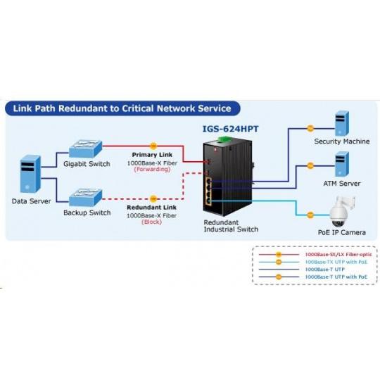 Planet IGS-624HPT, PoE switch 4x 1000Base-T, 2x SFP 100/1000Base-X, 802.3at 120W, DIN,IP30, -40 až +75st.C Přepínače pro průmyslový Ethernet jsou určeny do náročných provozních podmínek s velkým rozsahem pracovních teplot, nejistým napájením a častými otřesy. Verze přepínačů řady s rozšířeným teplotním rozsahem. Přepínače řady IGS se snadno instalují na standardní DIN lištu nebo přímo na zeď a umožňují nasazení dobře známé Ethernetové technologie i v průmyslovém prostředí. Stejně tak jsou vhodné pro instalace do venkovně umístěných skříní s velkým kolísáním pracovních teplot (typicky bezdrátové a MAN ISP aplikace). Jako PoE přepínač umožňuje přímo napájet až 4 koncová zařízení dle normy IEEE 802.3at, je tak ideálním prvkem pro aplikace se sníženou možností napajení. Vlastnosti: - 4x 1000Base-T, Switching, Full Duplex (1000/2000 Mbps), Auto-Negotiation (10/100/1000 Mbps), automatická detekce přímý/křížený kabel na každém portu - na všechny metalické porty implementace PoE IEEE 802.3at injektory se zatížitelností 30W/port, celkově až 120W - 2x SFP 100-FX / 1000Base-X pro instalaci mini-GBIC modulů, sdílené porty s 5 a 6 TP portem - propustnost: sběrnice 12Gbps, provozně 8.93Mp/s(64Bajtů) - 1k MAC adres, MTU max. 9216Bajtů - DIP přepínače pro nastavení práce portů, LED indikátory stavu provozu - instalace na DIN lištu, montážní díl součástí - instalace na zeď, montážní díl součástí - krytí IP30 - napájení: 48V DC redundantní, připojení možné ze dvou různých zdrojů (nejsou součástí balení); vlastní příkon do 15W - ochrana proti přepólování, připojení napájení na svorkovnici, umístění na spodním panelu (nepřekáží při montáži na zeď) - přepěťová ochrana napájení do 6kV proti napěťovým špičkám (EFT) - přepěťová ochrana LAN portů proti elektrostatickému náboji do 6kV (ESD) - zařízení je odolné proti pádu (IEC-60068-2-32) z výšky 75cm na všechny dopadové části - zařízení je odolné proti vibracím (IEC-60068-2-6) 10-500-10Hz, 4x g, 0,5oct/min - zařízení je odolné proti přetížení krátkodobému zrychlení 50g, dlouhodobému 4g, (IEC-60068-2-27) - EMI/EMS, elektromagnetická kompatibilita a slučitelnost dle CE EN-6100-4-2,3,4,5,6 - elektrická bezpečnost dle CE EN-60950 - pracovní teplota -40 až 75°C, vlhkost do 95% - rozměry: 152 x 107 x 32 mm - hmotnost: 1539g.