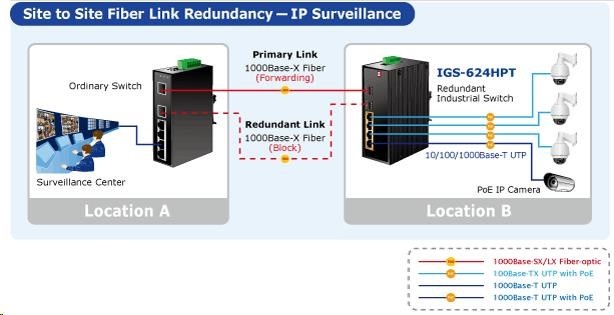 Planet IGS-624HPT, PoE switch 4x 1000Base-T, 2x SFP 100/1000Base-X, 802.3at 120W, DIN,IP30, -40 až +75st.C Přepínače pro průmyslový Ethernet jsou určeny do náročných provozních podmínek s velkým rozsahem pracovních teplot, nejistým napájením a častými otřesy. Verze přepínačů řady s rozšířeným teplotním rozsahem. Přepínače řady IGS se snadno instalují na standardní DIN lištu nebo přímo na zeď a umožňují nasazení dobře známé Ethernetové technologie i v průmyslovém prostředí. Stejně tak jsou vhodné pro instalace do venkovně umístěných skříní s velkým kolísáním pracovních teplot (typicky bezdrátové a MAN ISP aplikace). Jako PoE přepínač umožňuje přímo napájet až 4 koncová zařízení dle normy IEEE 802.3at, je tak ideálním prvkem pro aplikace se sníženou možností napajení. Vlastnosti: - 4x 1000Base-T, Switching, Full Duplex (1000/2000 Mbps), Auto-Negotiation (10/100/1000 Mbps), automatická detekce přímý/křížený kabel na každém portu - na všechny metalické porty implementace PoE IEEE 802.3at injektory se zatížitelností 30W/port, celkově až 120W - 2x SFP 100-FX / 1000Base-X pro instalaci mini-GBIC modulů, sdílené porty s 5 a 6 TP portem - propustnost: sběrnice 12Gbps, provozně 8.93Mp/s(64Bajtů) - 1k MAC adres, MTU max. 9216Bajtů - DIP přepínače pro nastavení práce portů, LED indikátory stavu provozu - instalace na DIN lištu, montážní díl součástí - instalace na zeď, montážní díl součástí - krytí IP30 - napájení: 48V DC redundantní, připojení možné ze dvou různých zdrojů (nejsou součástí balení); vlastní příkon do 15W - ochrana proti přepólování, připojení napájení na svorkovnici, umístění na spodním panelu (nepřekáží při montáži na zeď) - přepěťová ochrana napájení do 6kV proti napěťovým špičkám (EFT) - přepěťová ochrana LAN portů proti elektrostatickému náboji do 6kV (ESD) - zařízení je odolné proti pádu (IEC-60068-2-32) z výšky 75cm na všechny dopadové části - zařízení je odolné proti vibracím (IEC-60068-2-6) 10-500-10Hz, 4x g, 0,5oct/min - zařízení je odolné proti přetížení krátkodobému zrychlení 50g, dlouhodobému 4g, (IEC-60068-2-27) - EMI/EMS, elektromagnetická kompatibilita a slučitelnost dle CE EN-6100-4-2,3,4,5,6 - elektrická bezpečnost dle CE EN-60950 - pracovní teplota -40 až 75°C, vlhkost do 95% - rozměry: 152 x 107 x 32 mm - hmotnost: 1539g.
