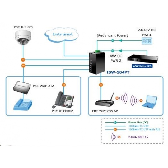 Planet ISW-504PT, 5x 10/100, 4x POE IEEE 802.3af, 60W, DIN, IP30, -40~75 st.C