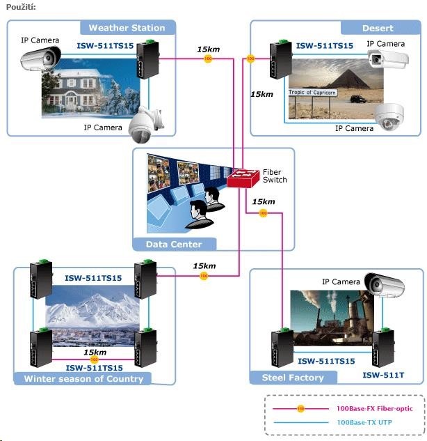 Planet ISW-511T, 4x 10/100Base-TX+ 1x 100FX 2km, MM, DIN, IP30, -40~75°C Přepínače pro průmyslový Ethernet jsou určeny do náročných provozních podmínek s velkým rozsahem pracovních teplot, nejistým napájením a častými otřesy. Přepínače řady ISW se snadno instalují na standardní DIN lištu nebo přímo na zeď a umožňují nasazení dobře známé Ethernetové technologie i v průmyslovém prostředí. Stejně tak jsou vhodné pro instalace do venkovně umístěných skříní s velkým kolísáním pracovních teplot (typicky bezdrátové a MAN ISP aplikace). Vlastnosti: - 4 porty 100Base-TX, Switching, Full Duplex (100/200 Mbps), Auto-Negotiation (10/100 Mbps), automatická detekce přímý/křížený kabel na každém portu - 1 port 100Base-FX, full duplex, SC konektory, multimodemode, pro 50/125um a 62,5/125um vlákno, dosah 2km, vlnová délka 1300nm, zdvih min. 15,5dB (vysílací výkon max. -14dBm, min. -19dBm, přijímací citlivost -34,5dBm) - 1M buffer, propustnost sběrnice 1Gbps, 0,74Mpps (64B), tabulka 2k MAC adres - pole LED indikátorů pro diagnostiku provozu - instalace na DIN lištu, montážní díl součástí - instalace na zeď, montážní díl součástí - krytí IP30, skříň celohliníková - napájení: 12-48V DC redundantní, připojení možné ze dvou různých zdrojů (nejsou součástí balení) - ochrana proti přepólování, připojení napájení na svorkovnici, umístění na spodním panelu (nepřekáží při montáži na zeď) - QoS prioritizace provozu dle portu, ToS, 802.1p - zařízení je odolné proti pádu (IEC-60068-2-32) z výšky 75cm na všechny dopadové části - zařízení je odolné proti vibracím (IEC-60068-2-6) 10-500-10Hz, 4x g, 0,5oct/min - zařízení je odolné proti přetížení krátkodobému zrychlení 50g, dlouhodobému 4g, (IEC-60068-2-27) - EMI/EMS, elektromagnetická kompatibilita a slučitelnost dle CE EN-6100-4-2,3,4,5,6 - elektrická bezpečnost dle CE EN-60950 - pracovní teplota -40 až 75°C, vlhkost do 95% - příkon do 14W - rozměry: 135 x 97 x 32 mm - hmotnost: 436g.