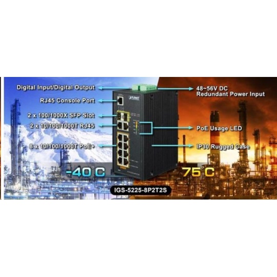 Planet switch IGS-5225-8P2T2S, PoE 8x 1000Base-T, 2x SFP, L2, SNMPv3, ONVIF, -40 až 75°C, 2x DC, IP30, 802.3at 240W