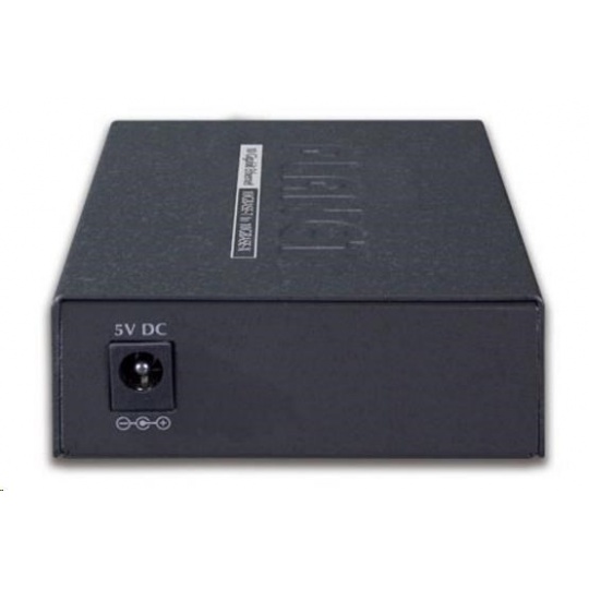 Jednoduchý media konvertor vybavený metalickým RJ-45 konektorem s rychlostí 100/1000/2,5G/5G/10G a optickým SFP+ portem s rychlostí až 10GBASE. Použití je vhodné v sítích, kde je vyžadována extrémně vysoká šířka pásma, jako jsou například data centra, cloudová úložiště, nebo infrastruktura operátorů. Díky spolehlivosti je zaručena vysoká přenosová rychlost bez rizika ztráty paketů při extrémní rychlosti. Samozřejmostí je ochrana až 6 KV DC ESD. Další výhodou je nízká spotřeba 3,75 W při plné zátěži. ZÁKLADNÍ SPECIFIKACE Fyzické vlastnosti: Porty: 1 x RJ-45 100/1000/2,5G/5G/10GBASE-T, 1 x SFP+ 10GBASE-XR Podpora přenosu: JumboFrame 16K Propustnost: sběrnice 20 Gbps, provozně 2,48 Mpps (64B) Tabulka záznamů: 9K MAC adres Provedení: vnitřní Napájení: zdroj 5V DC, 2A max., celkový příkon do 3,75 W Ochrana: ESD 6 KV DC Provozní teplota: 0 až 50°C Rozměry: 94 x 70 x 26 mm Hmotnost: 180 g.