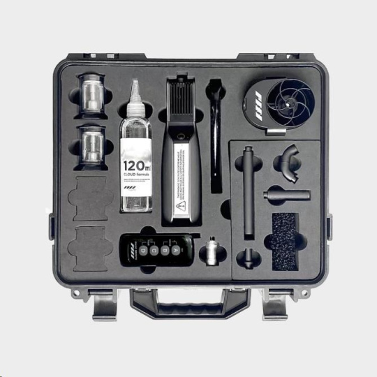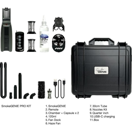 Kromě zařízení SmokeGENIE obsahuje profesionální sada bezdrátový dálkový ovladač, dvě vyměnitelné kouřové komory, adaptér pro filmový mlžný ventilátor, čtyři přesné trysky pro tvarování kouře, trysku pro tekutý kouř a 12" silikonovou prodlužovací trubku. Součástí balení je kapalina Cloud Formula, se kterou můžete ihned začít kouřit. Součástí balení jsou tři li-ion baterie 18650 a 23A baterie pro napájení zařízení SmokeGENIE a dálkového ovládání. Díky přiloženému ochrannému pevnému pouzdru budete mít zařízení SmokeGENIE a příslušenství při cestování v bezpečí.