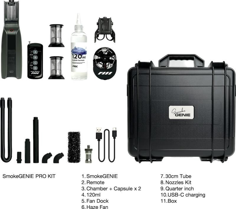 Profesionální sada SmokeGENIE, která umožňuje nezávislým tvůrcům vytvářet efekty mlhy, oparu, nízko visící mlhy a suchého ledu, je univerzální ruční zařízení, které poskytuje okamžitý kouř kdekoli a kdykoli. Rychle jím zamlžíte místnost a vytvoříte filmovou atmosféru nebo jej můžete použít venku při natáčení v náročných podmínkách.