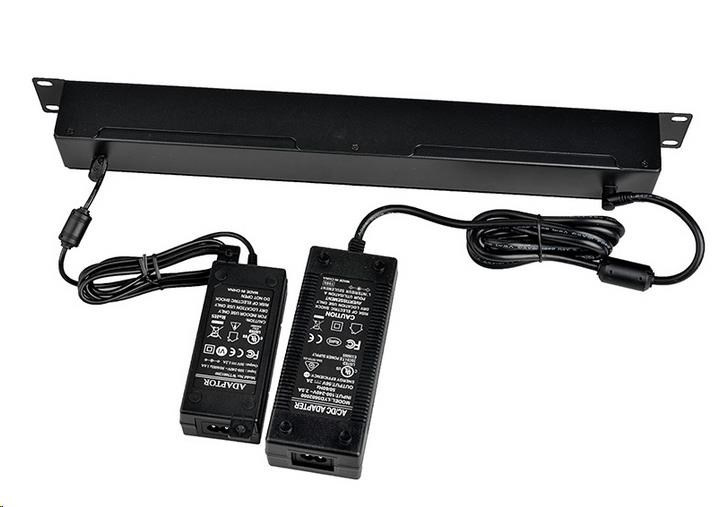V případě připojení napájecích adaptérů do obou napájecích vstupů, jsou z prvního vstupu napájeny porty 1-12, z druhého vstupu porty 13-24.