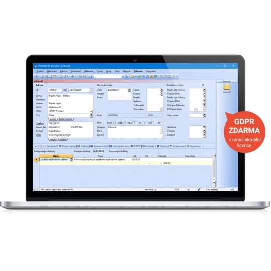 - správa osobních údajů dle GDPR - zpracování osobních údajů podle nařízení GDPR – evidence důvodů a doby zpracování údaje, přehled použití údaje na předprodejních, prodejních, poprodejních dokladech