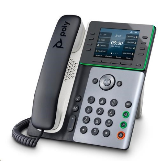 | Audio | Poly HD Voice; Technologie Poly Acoustic Clarity zajišťuje plně duplexní hovory a potlačuje akustickou ozvěnu i okolní šum; Technologie Poly Acoustic Fence potlačuje okolní hluk při použití sluchátka nebo kabelové náhlavní soupravy; Technologie Poly NoiseBlockAI odstraňuje většinu okolního hluku při používání konferenčního reproduktoru; Aplikace Poly Computer Audio Connector nainstalovaná v počítači (pouze Windows) umožňuje vybrat telefon pro zvukový vstup a výstup počítače a použít s počítačovými aplikacemi sluchátka, volitelné náhlavní soupravy a handsfree hlasitého odposlechu; Širokopásmový zvuk TIA-920, v souladu s typem 1 (plně duplexní IEEE 1329); Individuální nastavení hlasitosti s vizuální zpětnou vazbou pro každou zvukovou cestu; Detekce hlasové aktivity; Komfortní tvorba hluku; Generování tónů DTMF (RFC 2833 a v pásmu); Přenos zvukových paketů s nízkým zpožděním; Adaptivní paměti pro vyrovnání zpoždění |