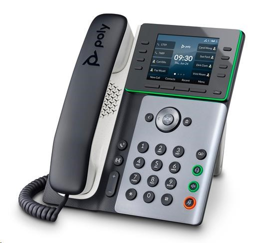 | Audio | Poly HD Voice; Technologie Poly Acoustic Clarity zajišťuje plně duplexní hovory a potlačuje akustickou ozvěnu i okolní šum; Technologie Poly Acoustic Fence potlačuje okolní hluk při použití sluchátka nebo kabelové náhlavní soupravy; Technologie Poly NoiseBlockAI odstraňuje většinu okolního hluku při používání konferenčního reproduktoru; Aplikace Poly Computer Audio Connector nainstalovaná v počítači (pouze Windows) umožňuje vybrat telefon pro zvukový vstup a výstup počítače a použít s počítačovými aplikacemi sluchátka, volitelné náhlavní soupravy a handsfree hlasitého odposlechu; Širokopásmový zvuk TIA-920, v souladu s typem 1 (plně duplexní IEEE 1329); Individuální nastavení hlasitosti s vizuální zpětnou vazbou pro každou zvukovou cestu; Detekce hlasové aktivity; Komfortní tvorba hluku; Generování tónů DTMF (RFC 2833 a v pásmu); Přenos zvukových paketů s nízkým zpožděním; Adaptivní paměti pro vyrovnání zpoždění |