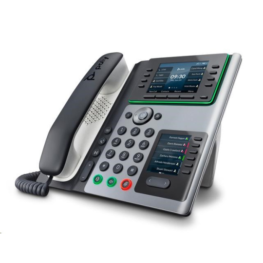 | Audio | Poly HD Voice; Technologie Poly Acoustic Clarity zajišťuje plně duplexní hovory a potlačuje akustickou ozvěnu i okolní šum; Technologie Poly Acoustic Fence potlačuje okolní hluk při použití sluchátka nebo kabelové náhlavní soupravy; Technologie Poly NoiseBlockAI odstraňuje většinu okolního hluku při používání konferenčního reproduktoru; Aplikace Poly Computer Audio Connector nainstalovaná v počítači (pouze Windows) umožňuje vybrat telefon pro zvukový vstup a výstup počítače a použít s počítačovými aplikacemi sluchátka, volitelné náhlavní soupravy a handsfree hlasitého odposlechu; Design s vylepšenými basy; Širokopásmový zvuk TIA-920, v souladu s typem 1 (plně duplexní IEEE 1329); Individuální nastavení hlasitosti s vizuální zpětnou vazbou pro každou zvukovou cestu; Detekce hlasové aktivity; Komfortní tvorba hluku; Generování tónů DTMF (RFC 2833 a v pásmu); Přenos zvukových paketů s nízkým zpožděním; Adaptivní paměti pro vyrovnání zpoždění |