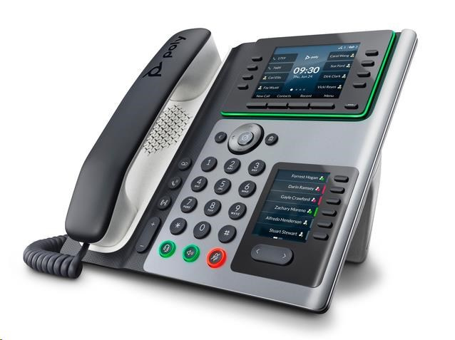 | Audio | Poly HD Voice; Technologie Poly Acoustic Clarity zajišťuje plně duplexní hovory a potlačuje akustickou ozvěnu i okolní šum; Technologie Poly Acoustic Fence potlačuje okolní hluk při použití sluchátka nebo kabelové náhlavní soupravy; Technologie Poly NoiseBlockAI odstraňuje většinu okolního hluku při používání konferenčního reproduktoru; Aplikace Poly Computer Audio Connector nainstalovaná v počítači (pouze Windows) umožňuje vybrat telefon pro zvukový vstup a výstup počítače a použít s počítačovými aplikacemi sluchátka, volitelné náhlavní soupravy a handsfree hlasitého odposlechu; Design s vylepšenými basy; Širokopásmový zvuk TIA-920, v souladu s typem 1 (plně duplexní IEEE 1329); Individuální nastavení hlasitosti s vizuální zpětnou vazbou pro každou zvukovou cestu; Detekce hlasové aktivity; Komfortní tvorba hluku; Generování tónů DTMF (RFC 2833 a v pásmu); Přenos zvukových paketů s nízkým zpožděním; Adaptivní paměti pro vyrovnání zpoždění |