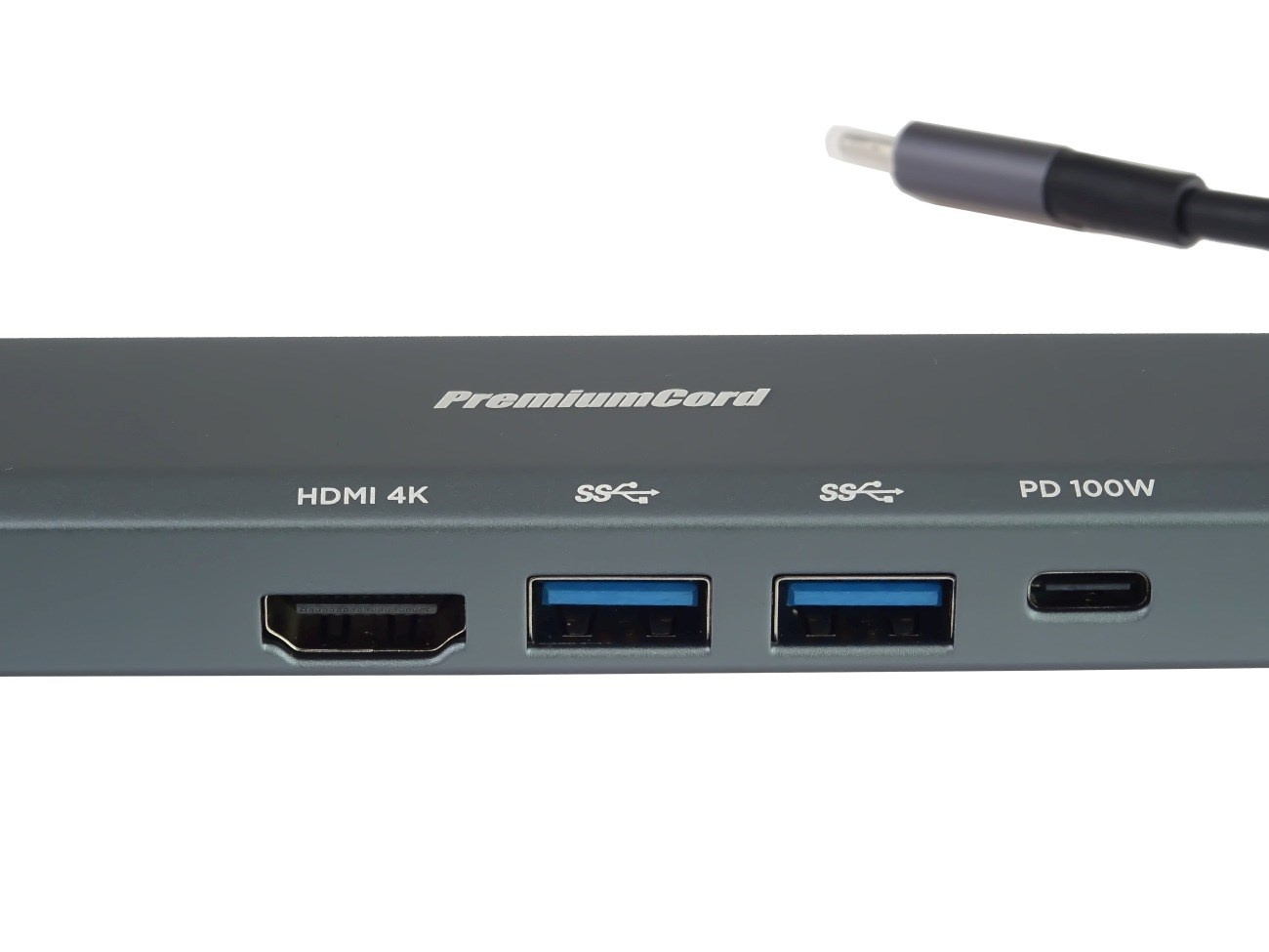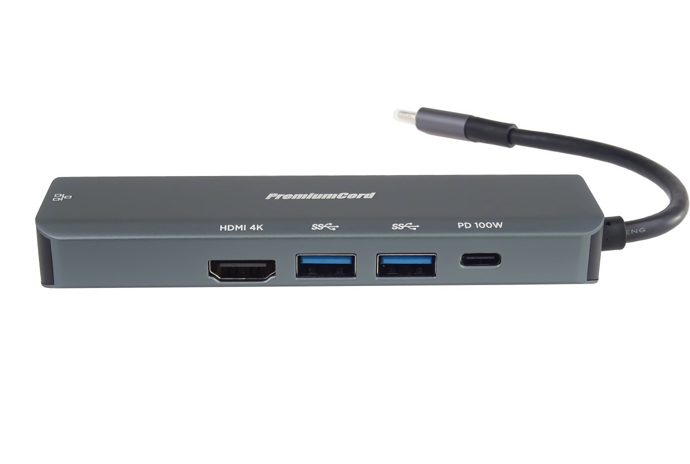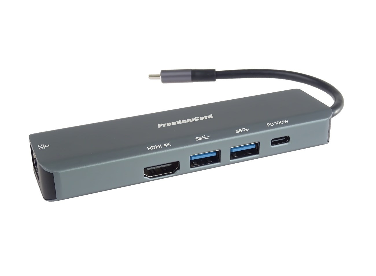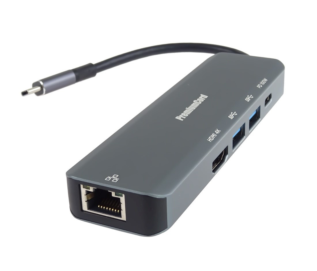PREMIUMCORD Adaptér USB-C na Gigabit 10/100/1000Mbps + 1x HDMI, 2x USB3.2, 1x PD 100W konektor, Šedá