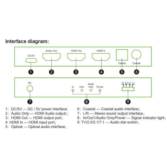 Extraktor umožňuje oddělit audio signál z HDMI vstupu na analogový nebo digitální výstup, který je vyveden na konektory: StereoJack 3,5mm, Digitální audio RCA CINCH, Digitální optický TOSLINK (SPDIF) nebo HDMI vyhrazený pro audio výstup.