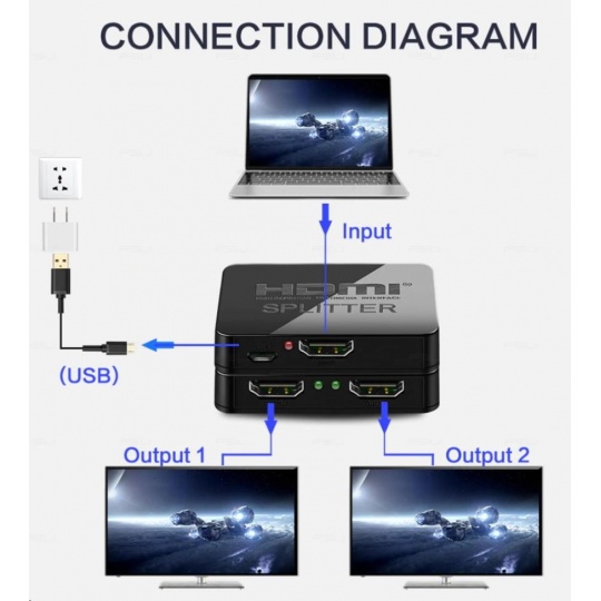 HDMI Video Splitter 1 => 2 Porty, 3D, 4K x 2K, FULL HD s napájením z USB