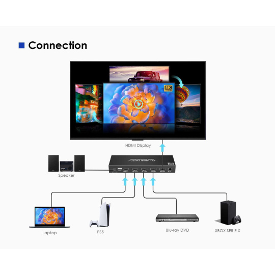 PremiumCord HDMI switch 4:1 s podporou rozlišení 8K@60Hz,4K@120Hz, 1080P, HDR, s dálkovým ovladačem