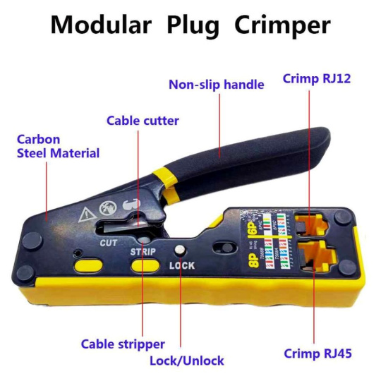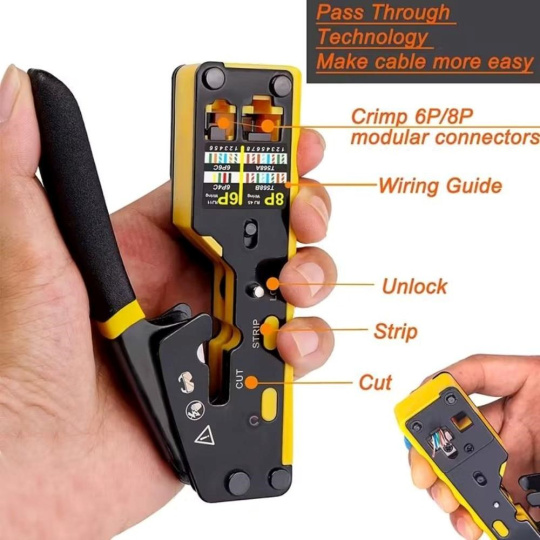 PremiumCord krimpovací kleště na průchozí RJ konektory jsou spolehlivým univerzálním nástrojem pro práci s většinou běžných modulárních zástrček řady RJ — včetně RJ11, RJ12, RJ14, RJ45 a dalších typů. Díky konstrukci 3 v 1 umožňují snadné krimpování, stříhání i odizolování kabelů, což výrazně urychluje a zpřesňuje práci při výrobě či opravách síťových a telefonních vedení.