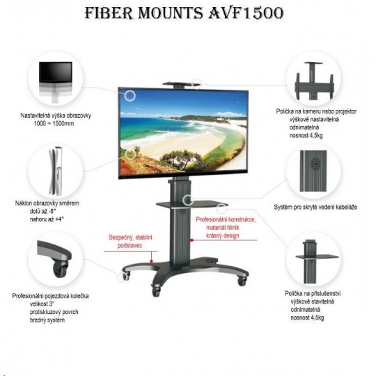 Technické údaje: •maximální zatížení 36,4kg •podporuje VESA standarty 200x100 až 600x400 •na Tv 32" až 60" •min. výška stojanu 1200mm •max. výška stojanu 1500mm •náklon obrazovky +4° až -8° •police na příslušenství - součást balení •police na kameru - součást balení •profesionální konstrukce - top kvalita •pojezdová kolečka s brzdou •dokonalá stabilita •materiál hliník •barevné provedení černé •záruka 5 let Televizní stojan AVF1500 podporuje VESA standardy: •VESA 200x100 •VESA 200x200 •VESA 300x200 •VESA 300x300 •VESA 400x200 •VESA 400x300 •VESA 400x400 •VESA 600x400.