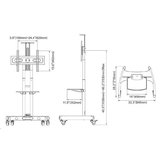 Technické údaje: maximální zatížení 45,3kg na Tv 32" až 65" VESA standart 100x100 až 600x400 min. výška stojanu 1050mm max. výška stojanu 1500mm nastavitelná výška obrazovky funkce uzamčení televizoru systém vedení kabeláže police na příslušenství (odnímatelná, součást balení) polička na kameru, webkameru nebo projektor (odnímatelná, součást balení) pojezdová kolečka s brzdou dokonalá stabilita profesionální konstrukce velmi pěkný design záruka 5 let.